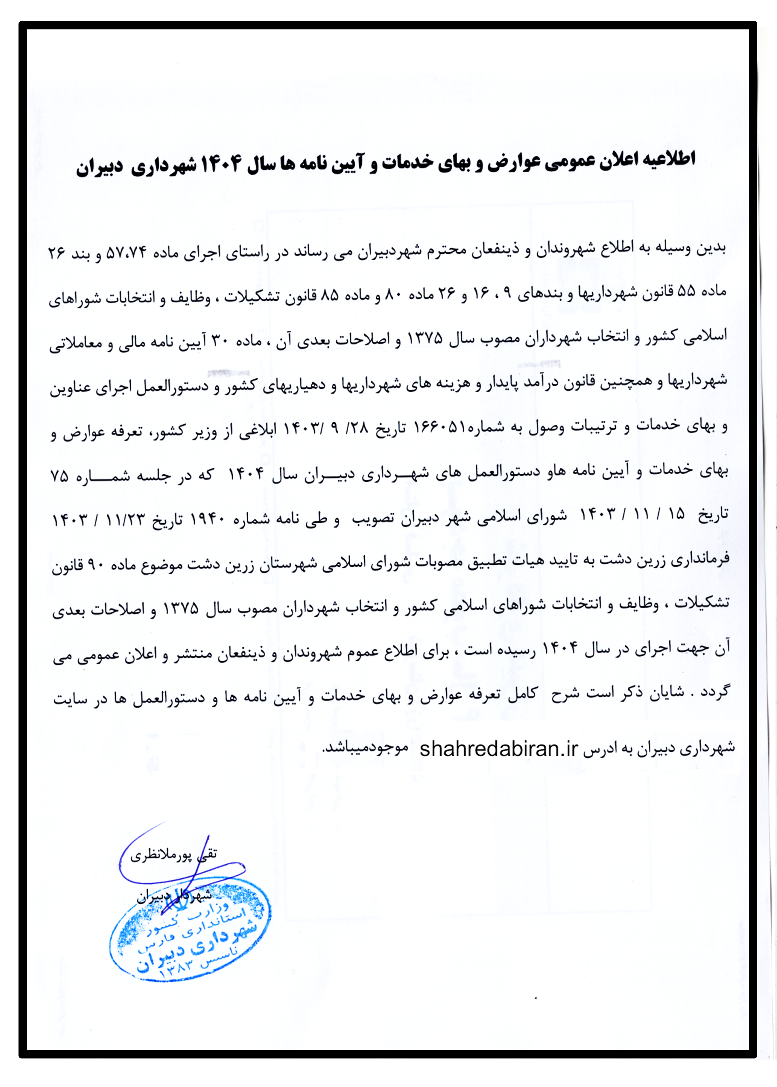 به اطلاع عموم شهروندان میرساند دفترچه تعرفه عوارض سـال ۱۴۰۴ شهرداری دبیران برابر قانون تشکیلات، وظایف و اختیــارات شـــورای اسلامی شهر و انتخاب شهرداران و رعایت دستورالعمل های مربوطــه تهیه و تصویب گردید، شهـروندان محتـــرم میتوانند جهـت مشاهــده تعرفه عوارض سال ۱۴۰۴ شهرداری،ازلینک زیر دانلودنمایید